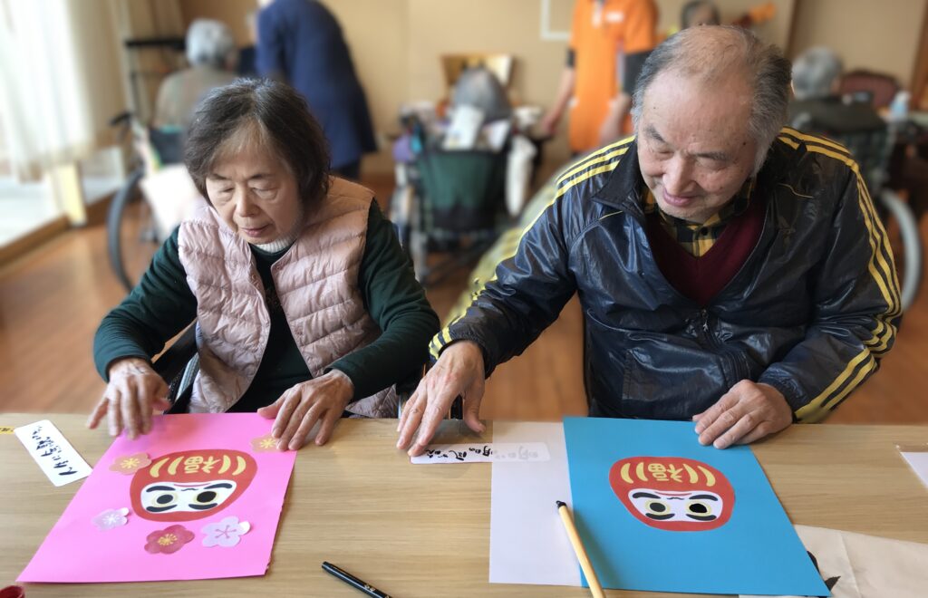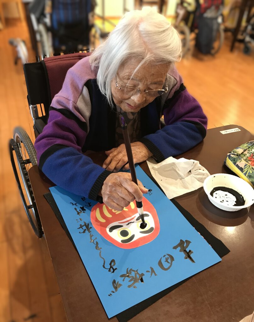 書道をしたり、だるまの絵を貼って思い思いのデコレーションをしたり…
